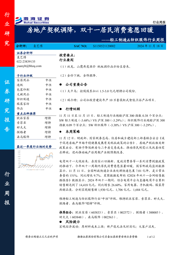 【渤海证券】【20241118】轻工制造&纺织服饰行业周报:房地产契税调降,双十一居民消费意愿回暖-12页