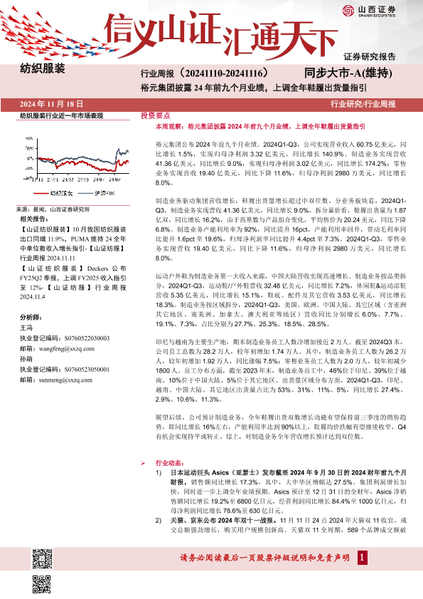 【山西证券】【20241118】纺织服装行业周报:裕元集团披露24年前九个月业绩,上调全年鞋履出货量指引-18页