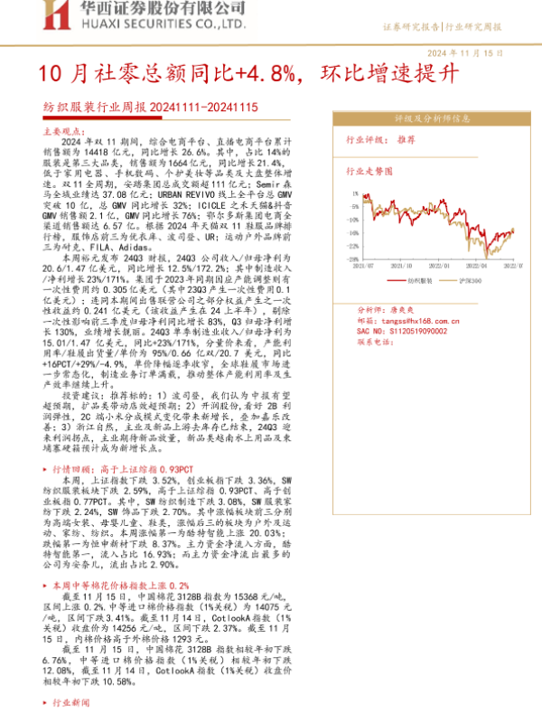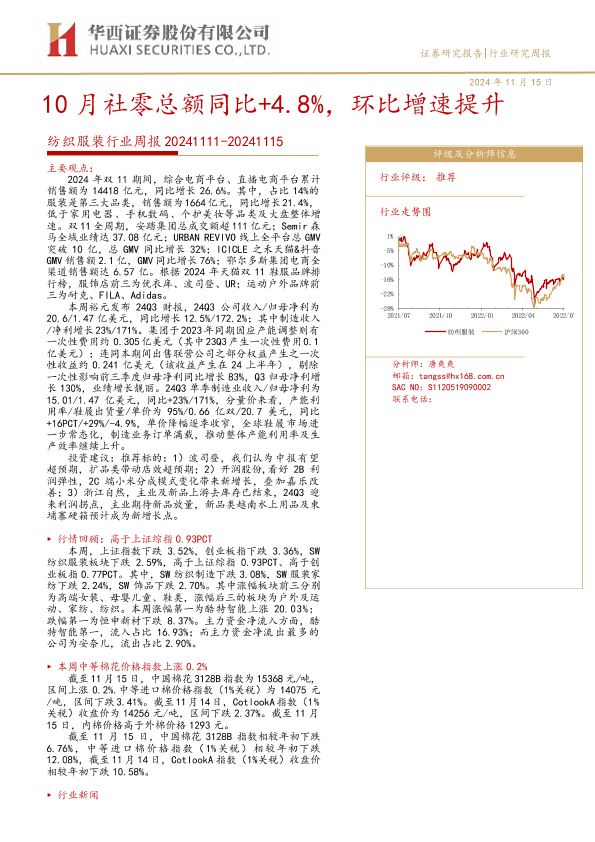 【华西证券】【20241115】20241115-华西证券-纺织服装行业周报:10月社零总额同比+4.8%,环比增速提升-38页