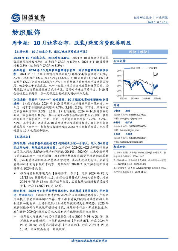 【国盛证券】【20241117】纺织服饰周专题:10月社零公布,服装 珠宝消费改善明显-15页