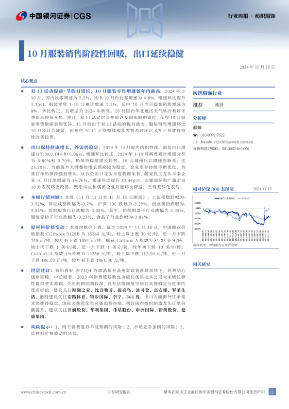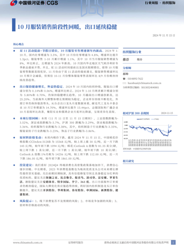 【银河证券】【20241115】20241115-中国银河-纺织服饰行业周报:10月服装销售阶段性回暖,出口延续稳健-20页