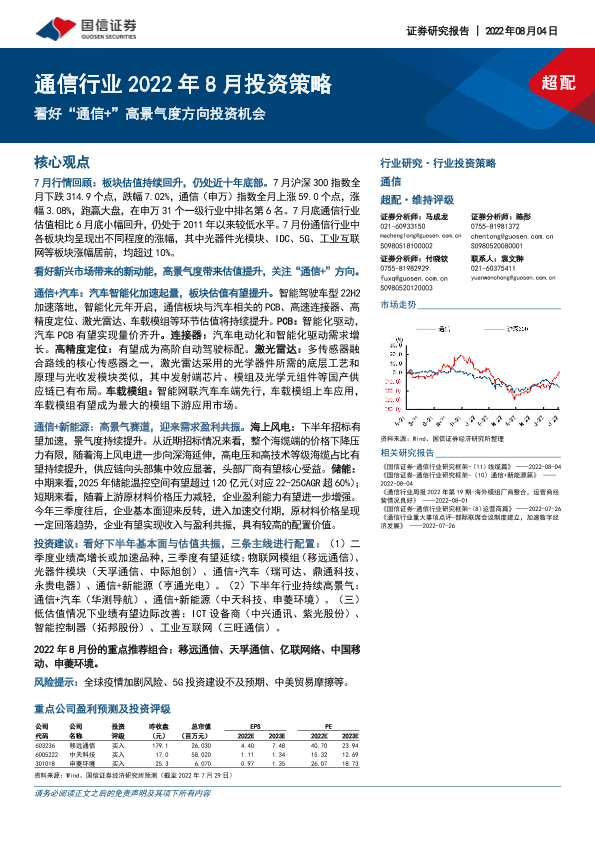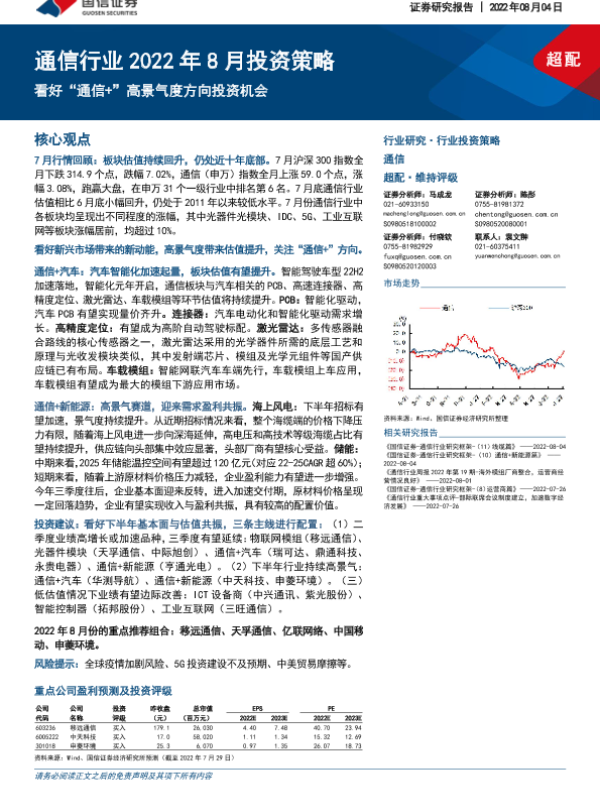 【国信证券】【20220804】通信行业2022年8月投资策略:看好“通信+”高景气度方向投资机会-28页