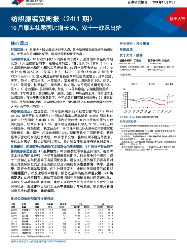 【国信证券】【20241119】20241119-国信证券-纺织服装双周报(2411期):10月服装社零同比增长8%,双十一战况出炉-21页