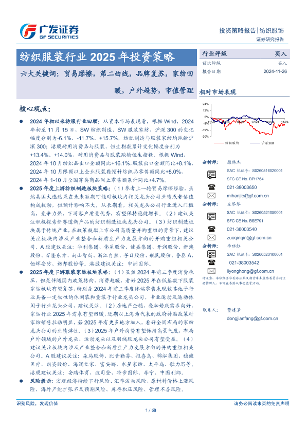 【广发证券】【20241126】纺织服装行业2025年投资策略:六大关键词:贸易摩擦,第二曲线,品牌复苏,家纺回暖,户外趋势,市值管理-68页