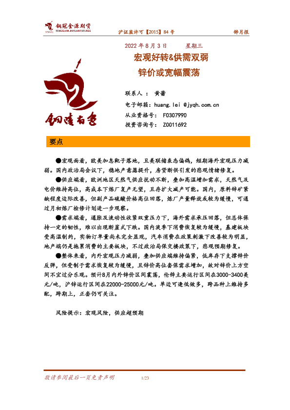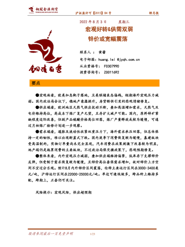 【铜冠金源期货】【20220803】锌月报:宏观好转&供需双弱,锌价或宽幅震荡-23页