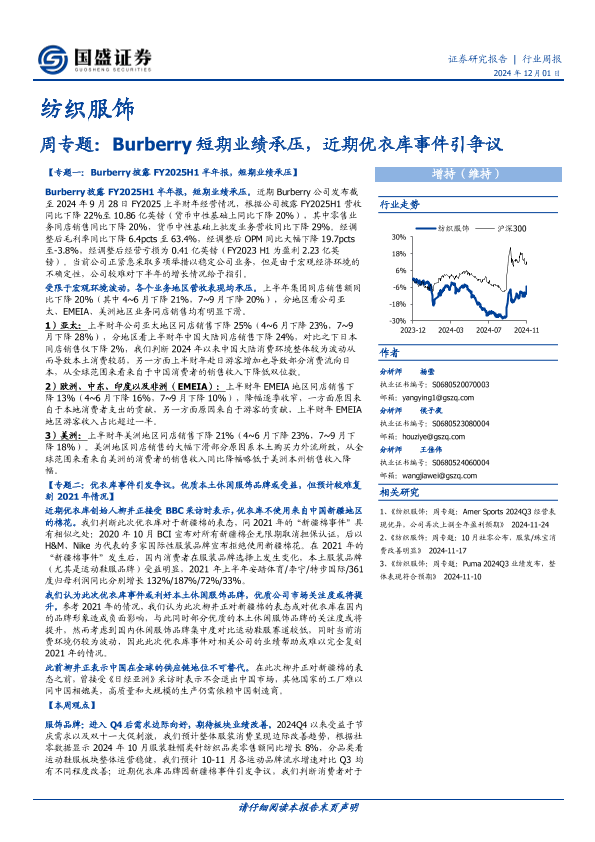 【国盛证券】【20241201】纺织服饰行业周专题:Burberry短期业绩承压,近期优衣库事件引争议-16页