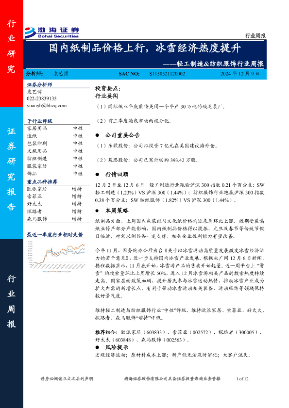 【渤海证券】【20241209】轻工制造&纺织服饰行业周报:国内纸制品价格上行,冰雪经济热度提升-12页