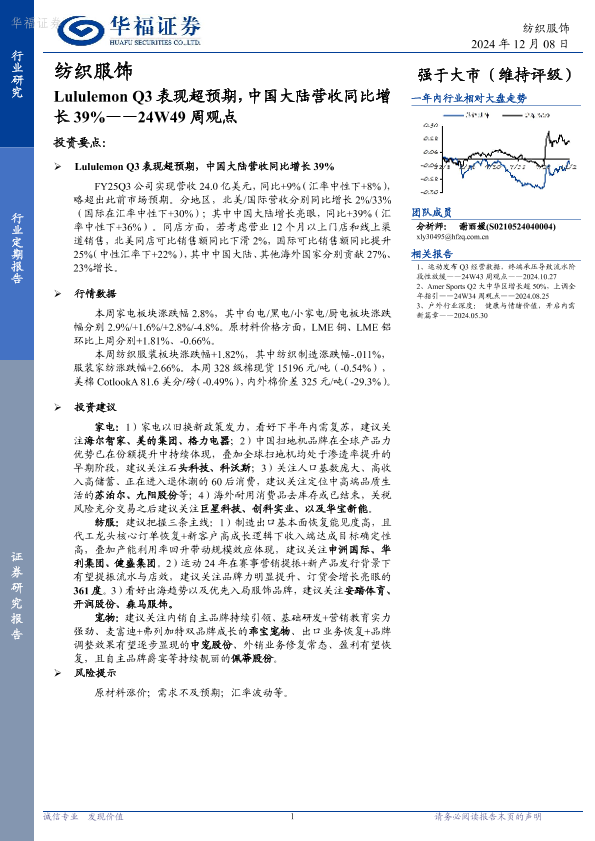 【华福证券】【20241208】20241208-华福证券-纺织服饰24W49周观点:Lululemon Q3表现超预期,中国大陆营收同比增长39%-14页
