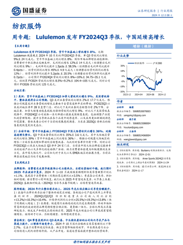 【国盛证券】【20241208】纺织服饰行业周专题:Lululemon发布FY2024Q3季报,中国延续高增长-12页