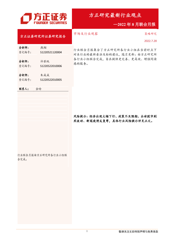 【方正证券】【20220728】研究最新行业观点:2022年8月联合月报-18页