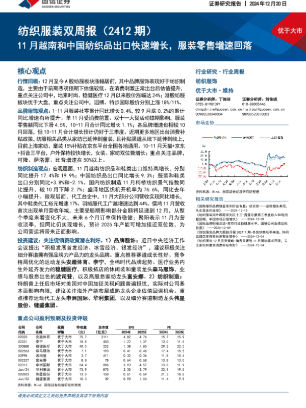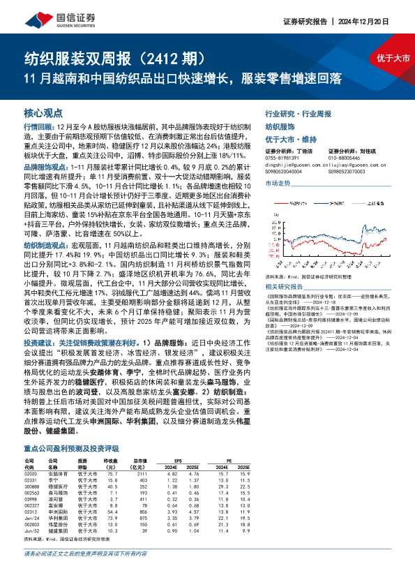【国信证券】【20241220】20241220-国信证券-纺织服装行业双周报(2412期):11月越南和中国纺织品出口快速增长,服装零售增速回落-18页