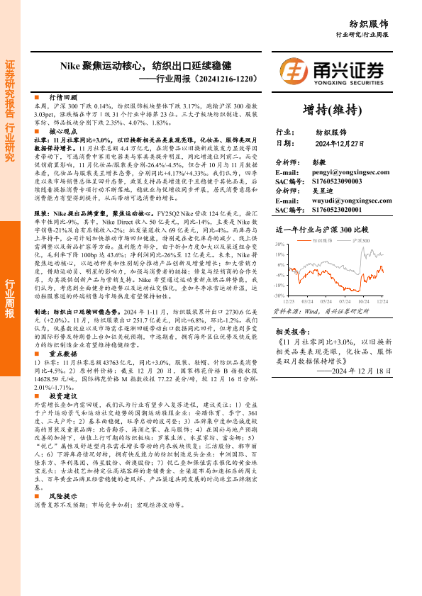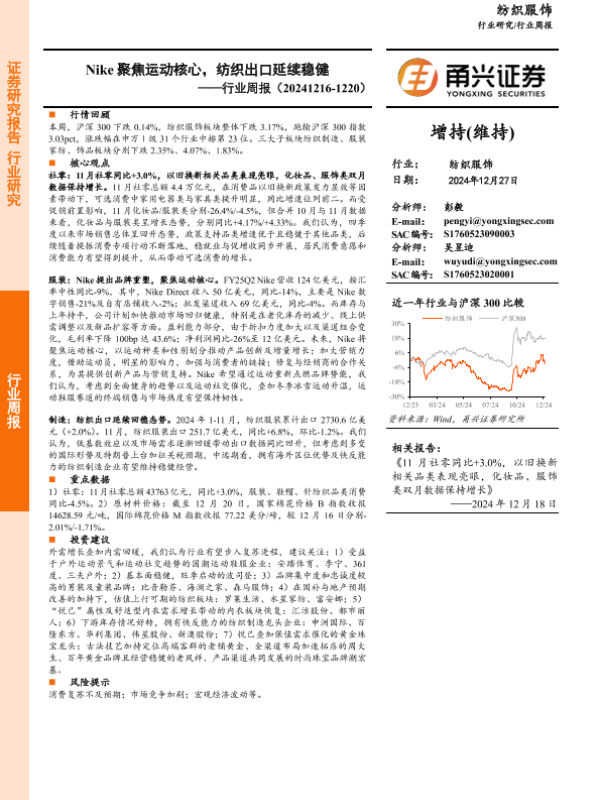 【甬兴证券】【20241227】20241227-甬兴证券-纺织服饰行业周报:Nike聚焦运动核心,纺织出口延续稳健-13页