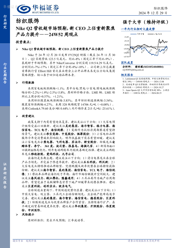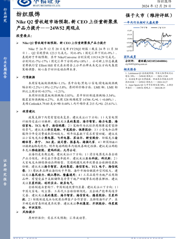 【华福证券】【20241229】纺织服饰24W52周观点:Nike Q2营收超市场预期,新CEO上任重新聚焦产品力提升-15页