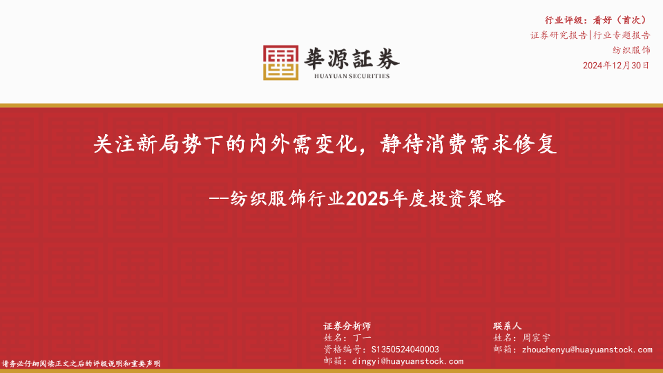 【华源证券】【20241230】纺织服饰行业2025年度投资策略:关注新局势下的内外需变化,静待消费需求修复-23页