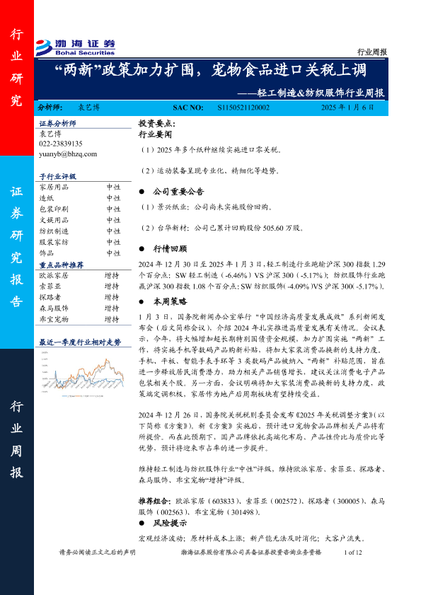 【渤海证券】【20250106】轻工制造&纺织服饰行业周报:“两新”政策加力扩围,宠物食品进口关税上调-12页