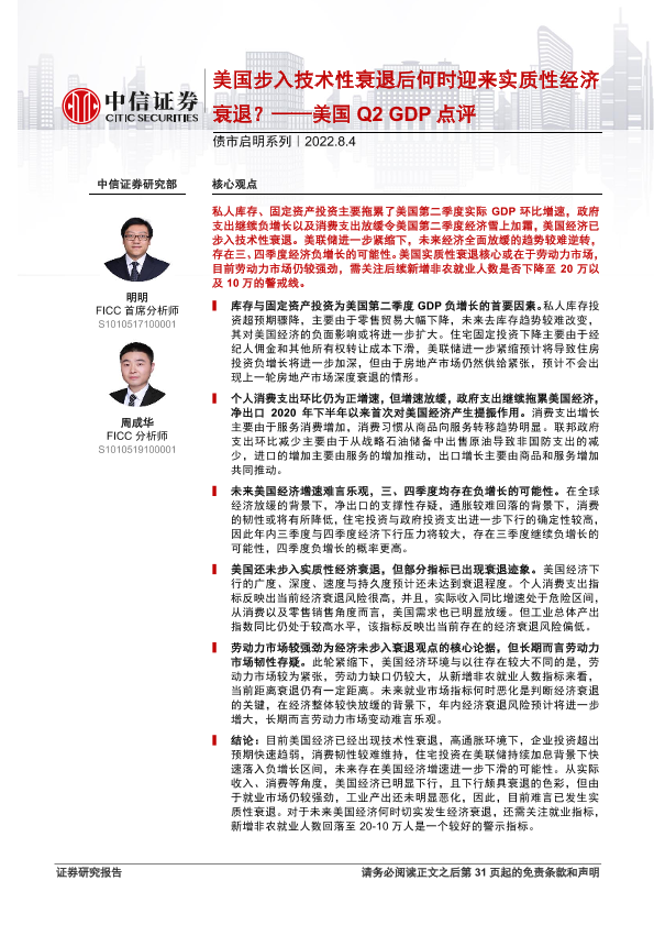 【中信证券】【20220804】美国Q2 GDP点评,美国步入技术性衰退后何时迎来实质性经济衰退?-32页