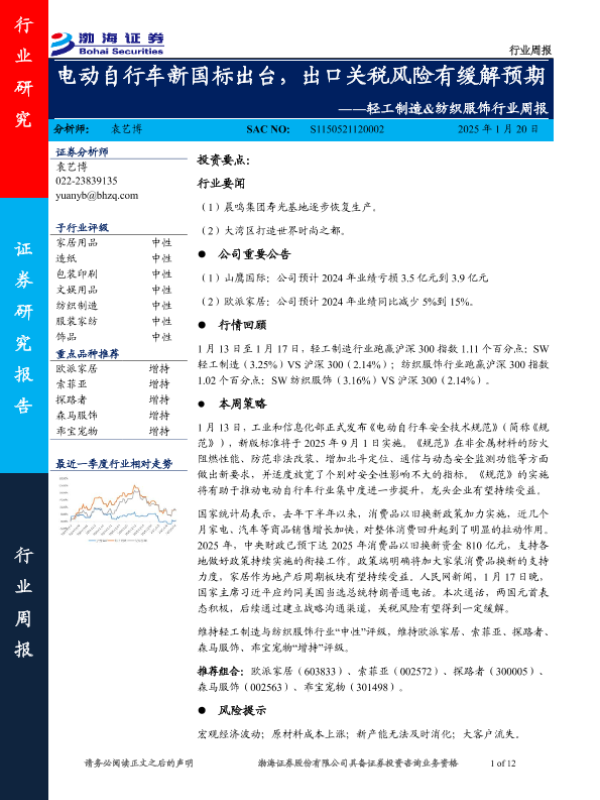 【渤海证券】【20250120】轻工制造&纺织服饰行业周报:电动自行车新国标出台,出口关税风险有缓解预期-12页
