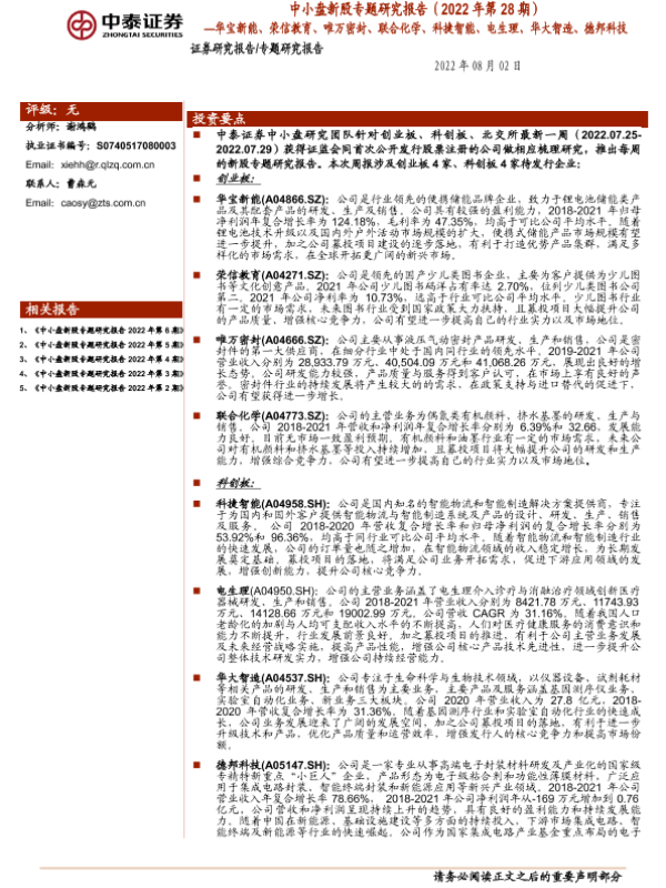 【中泰证券】【20220802】新股专题研究报告(2022年第28期):华宝新能、荣信教育、唯万密封、联合化学、科捷智能、电生理、华大智造、德邦科技-45页