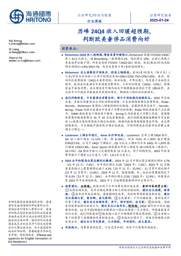 【海通国际】【20250124】20250124-海通国际-纺织与服装行业周报:历峰24Q4收入回暖超预期,判断欧美奢侈品消费向好-16页