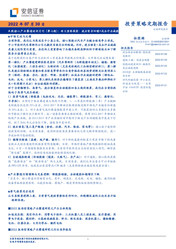 【安信证券】【20220730】A股核心产业赛道述评月刊(第七期):两大重要线索,疫后需求回暖+成本冲击减弱-40页