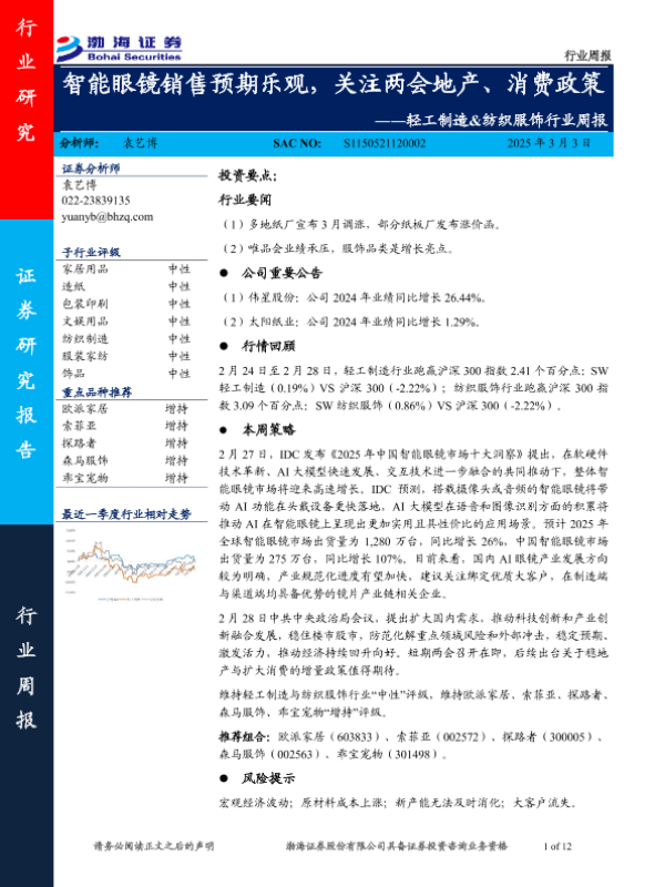 【渤海证券】【20250303】轻工制造&纺织服饰行业周报:智能眼镜销售预期乐观,关注两会地产、消费政策-12页