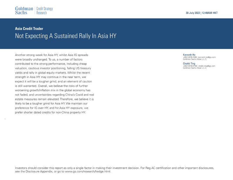 【Goldman Sachs】【20220730】Asia Credit Trader_ Not Expecting A Sustained Rally In Asia HY-33页