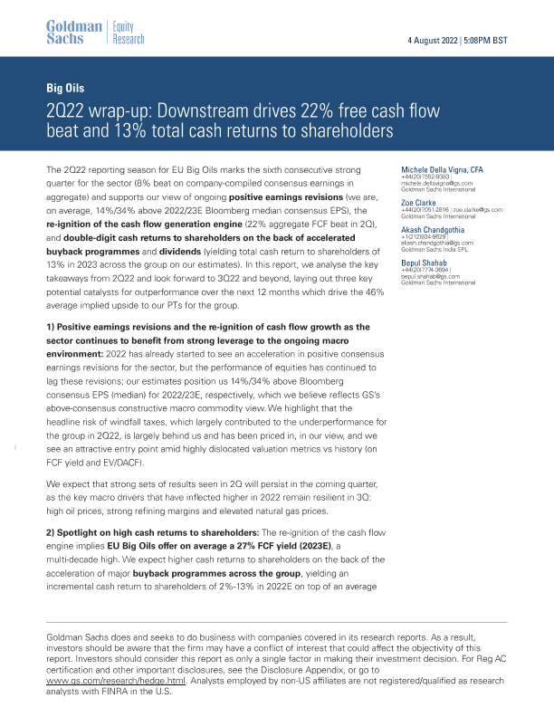 【Goldman Sachs】【20220804】2Q22 wrap-up Downstream drives 22% free cash flow beat and 13% total cash returns to shareholders-20页
