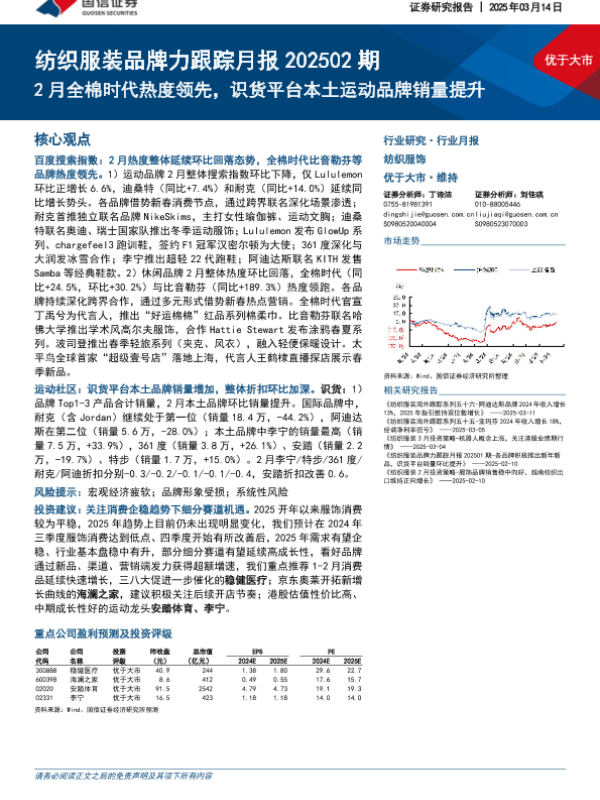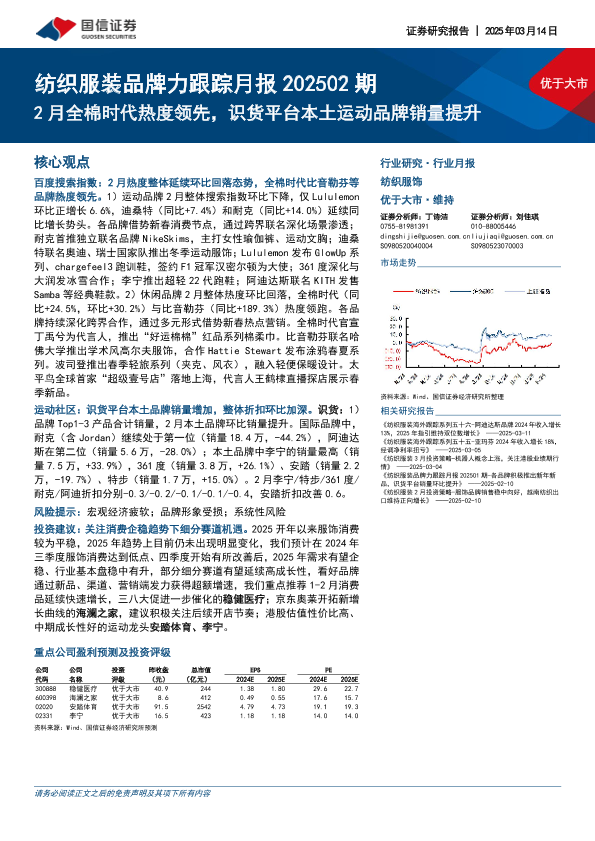 【国信证券】【20250314】20250314-国信证券-纺织服装品牌力跟踪月报202502期:2月全棉时代热度领先,识货平台本土运动品牌销量提升-13页