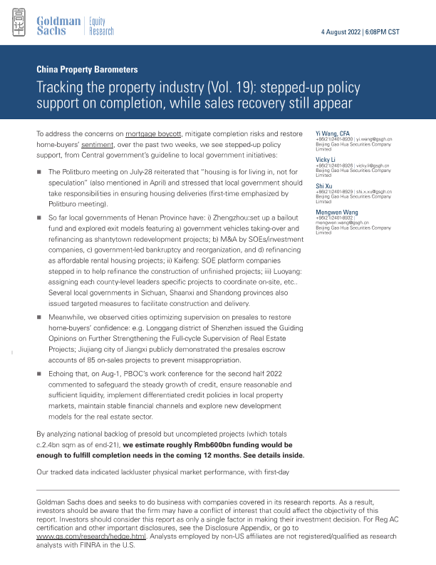 【Goldman Sachs】【20220804】跟踪房地产行业(Vol. 19) 加强政策支持以完成项目,而销售复苏仍显乏力-21页