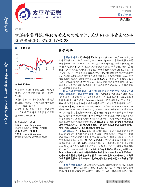 【太平洋证券】【20250324】纺服&零售行业周报:港股运动兑现稳健增长,关注Nike库存去化&品线调整进展-13页