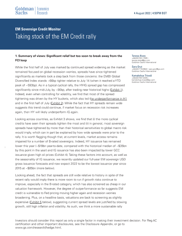 【Goldman Sachs】【20220804】EM Sovereign Credit Monitor Taking stock of the EM Credit rally-20页