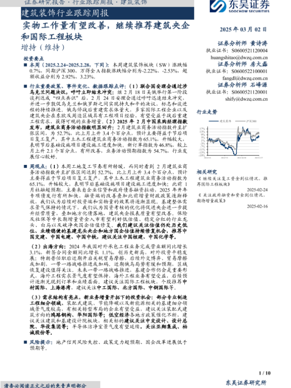 【东吴证券】【20250302】建筑装饰行业跟踪周报:实物工作量有望改善,继续推荐建筑央企和国际工程板块-10页