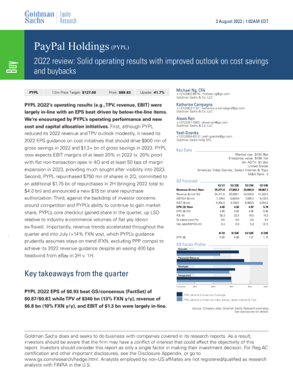 【Goldman Sachs】【20220803】2Q22 review Solid operating results with improved outlook on cost savings and buybacks-10页
