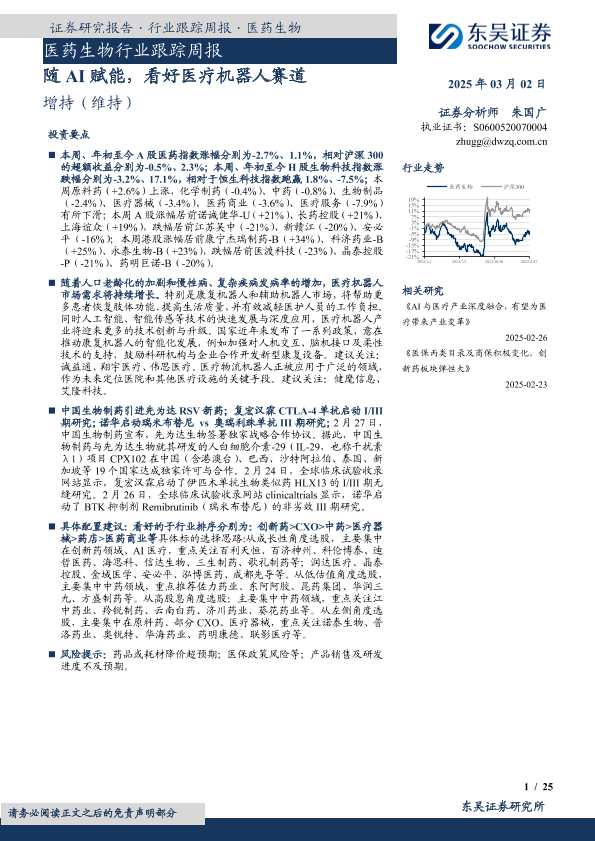 【东吴证券】【20250302】医药生物行业跟踪周报:随AI赋能,看好医疗机器人赛道-25页