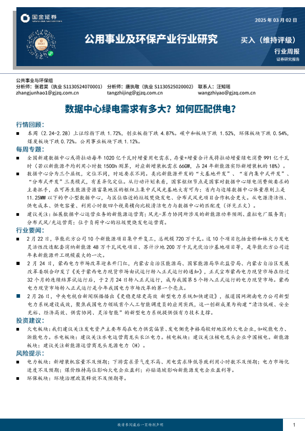 【国金证券】【20250302】公用事业及环保产业行业研究:数据中心绿电需求有多大?如何匹配供电?-19页