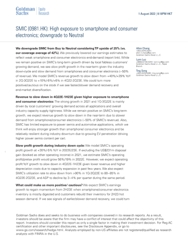 【Goldman Sachs】【20220801】SMIC(0981.HK) High exposure to smartphone and consumer electronics; downgrade to Neutral-10页