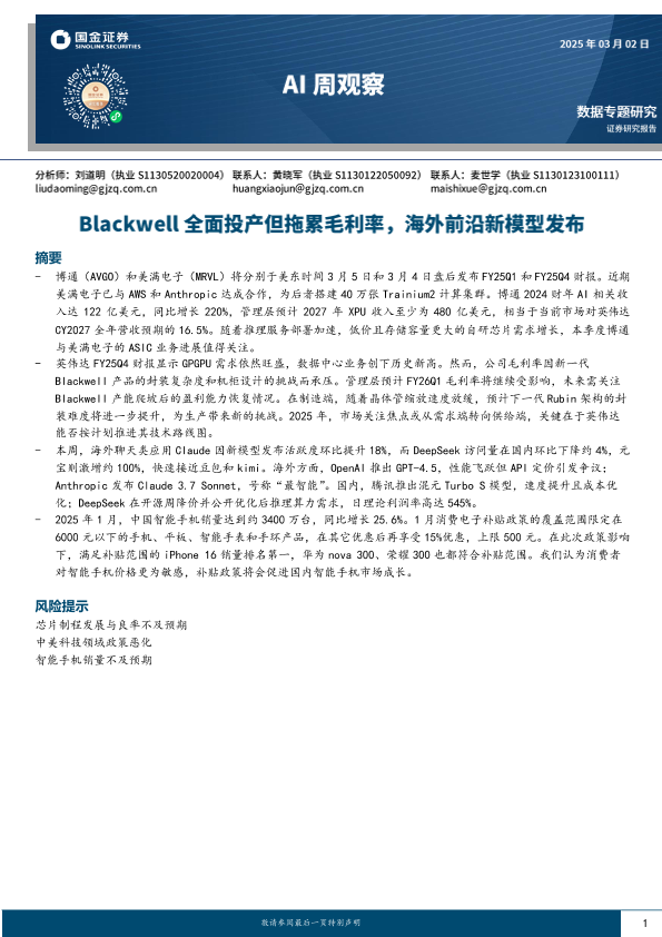 【国金证券】【20250302】国金证券-AI周观察:Blackwell全面投产但拖累毛利率,海外前沿新模型发布-10页