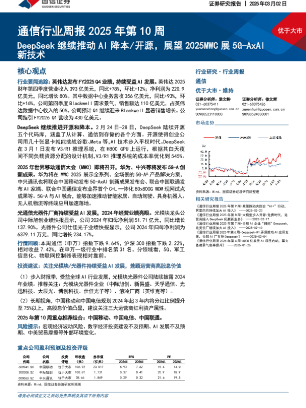 【国信证券】【20250302】通信行业周报2025年第10周:DeepSeek继续推动AI降本 开源,展望2025MWC展5G-AxAI新技术-16页