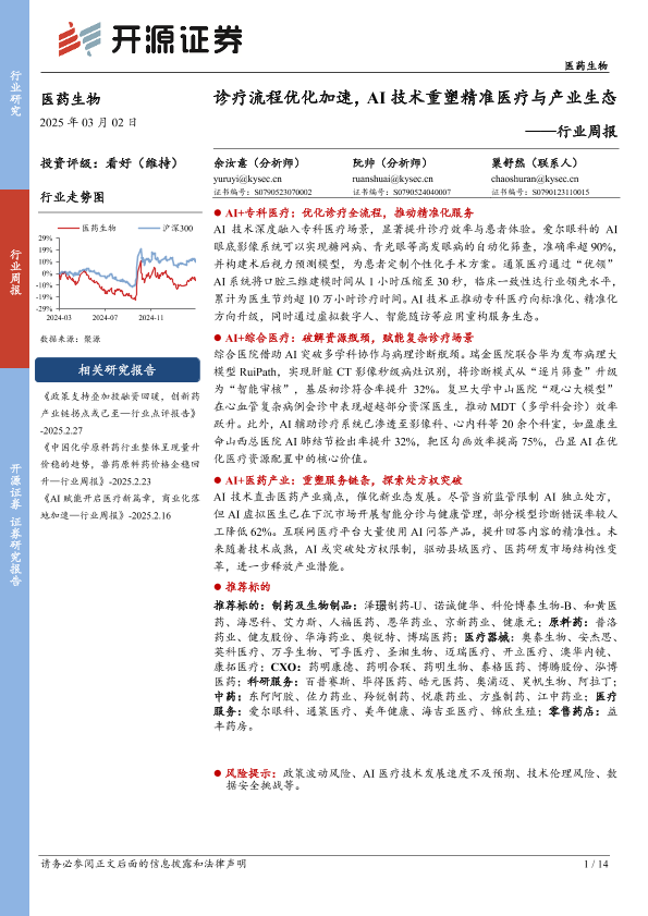 【开源证券】【20250302】医药生物行业周报:诊疗流程优化加速,AI技术重塑精准医疗与产业生态-14页
