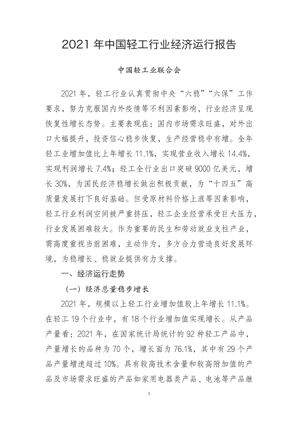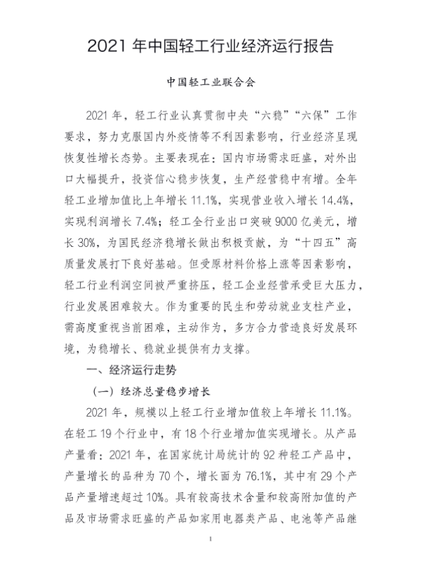 【中国轻工业联合会】【2021】2021年中国轻工行业经济运行报告-9页