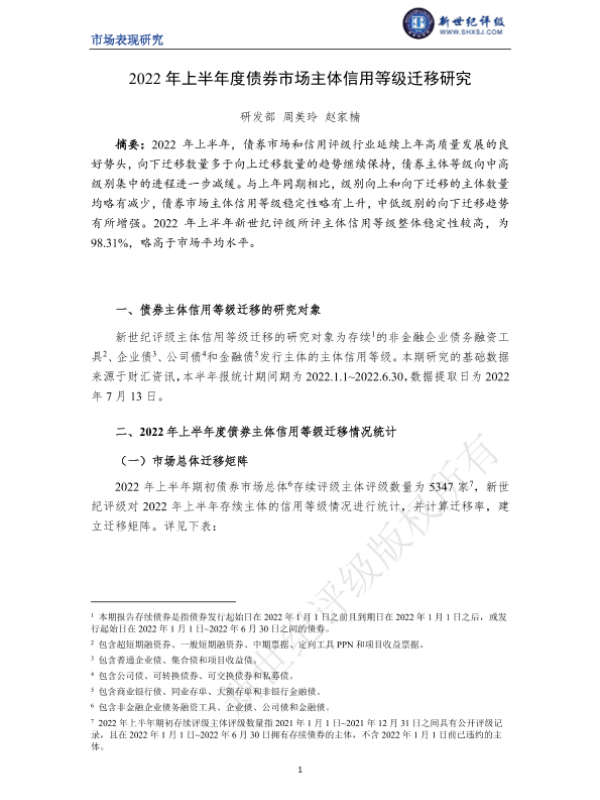 2022年上半年 信用等级 债券市场 新世纪评级 迁移研究