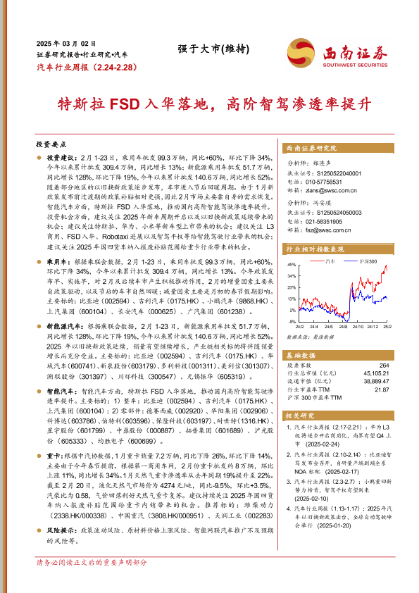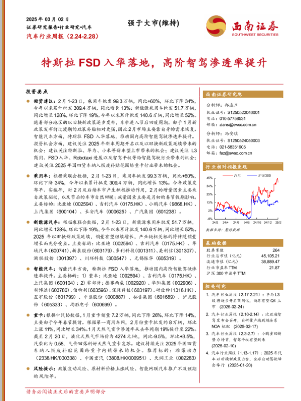 【西南证券】【20250302】20250302-西南证券-汽车行业周报:特斯拉FSD入华落地,高阶智驾渗透率提升-19页
