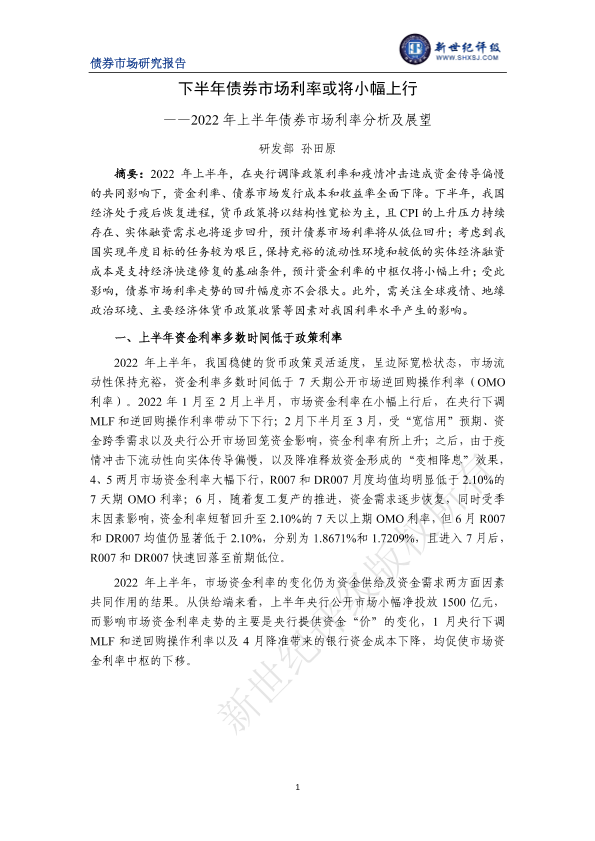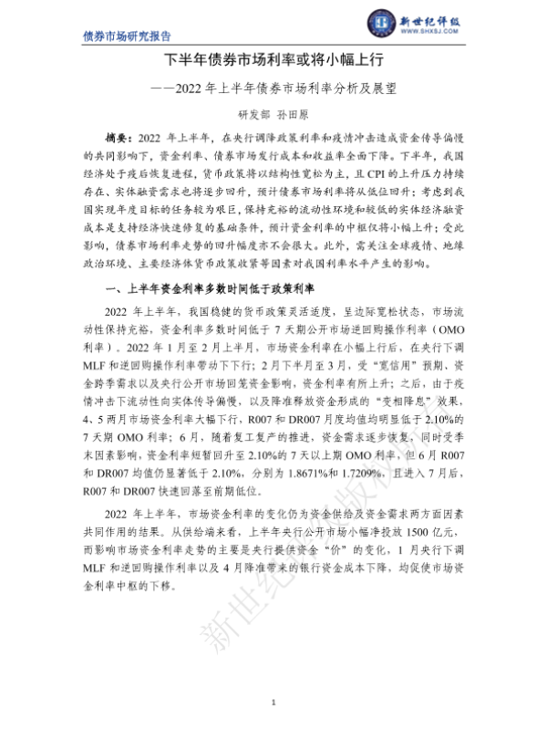 【新世纪评级】【2022】下半年债券市场利率或将小幅上行——2022年上半年债券市场利率分析及展望-8页