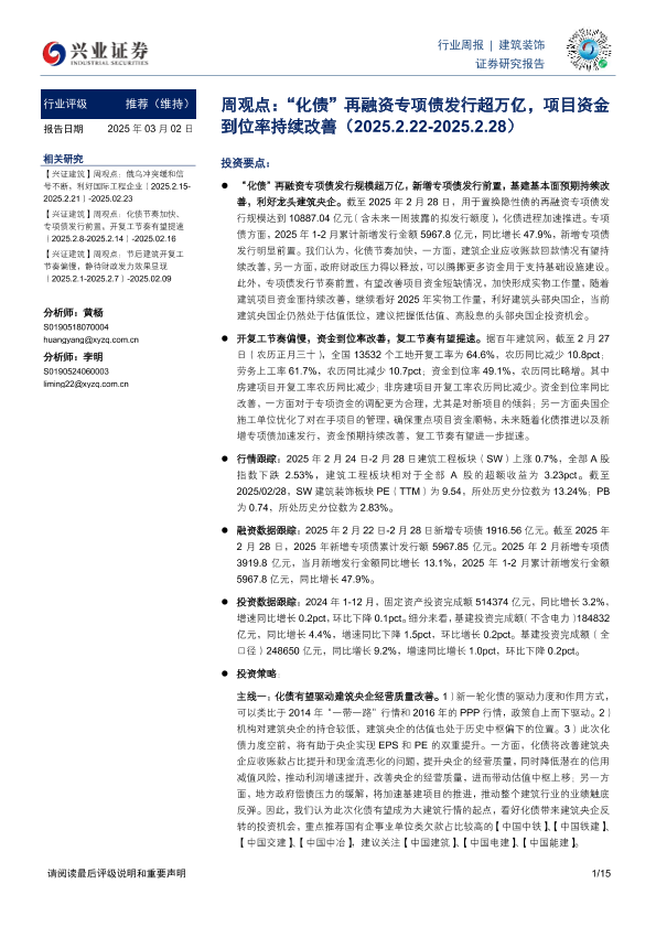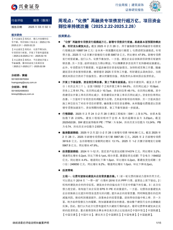 【兴业证券】【20250302】建筑装饰周观点:“化债”再融资专项债发行超万亿,项目资金到位率持续改善-15页
