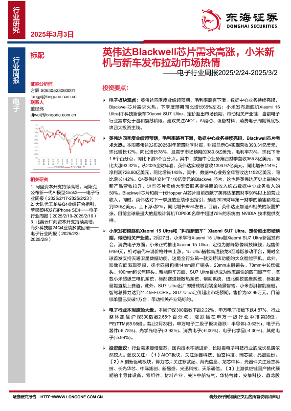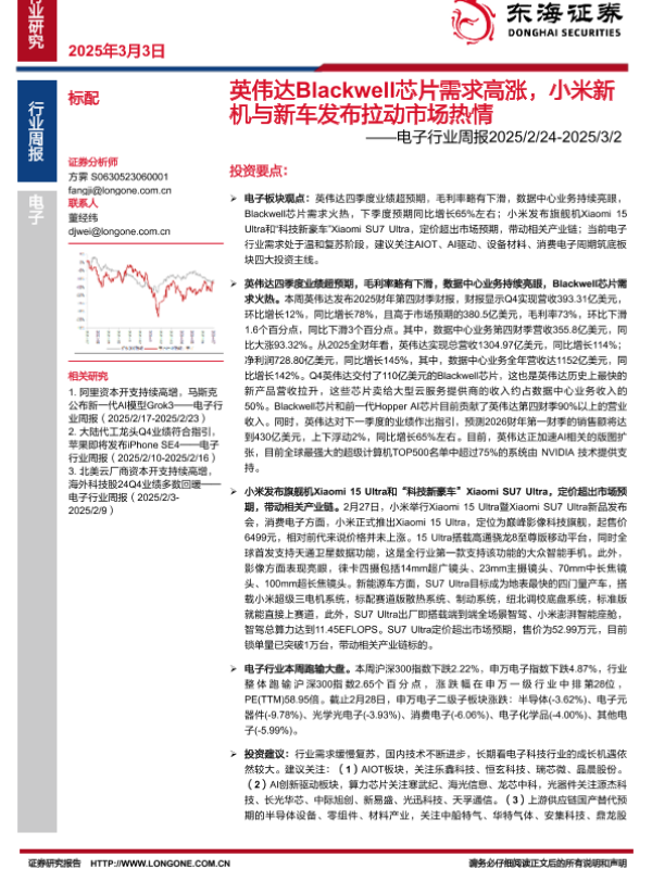 【东海证券】【20250303】20250303-东海证券-电子行业周报:英伟达Blackwell芯片需求高涨,小米新机与新车发布拉动市场热情-16页