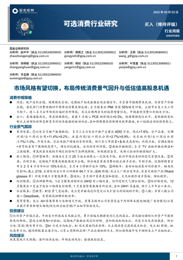 【国金证券】【20250303】国金证券-可选消费行业研究:市场风格有望切换,布局传统消费景气回升与低估值高股息机遇-14页