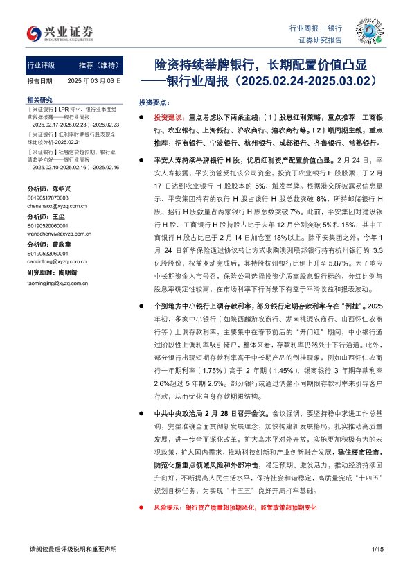 【兴业证券】【20250303】20250303-兴业证券-银行业周报:险资持续举牌银行,长期配置价值凸显-15页