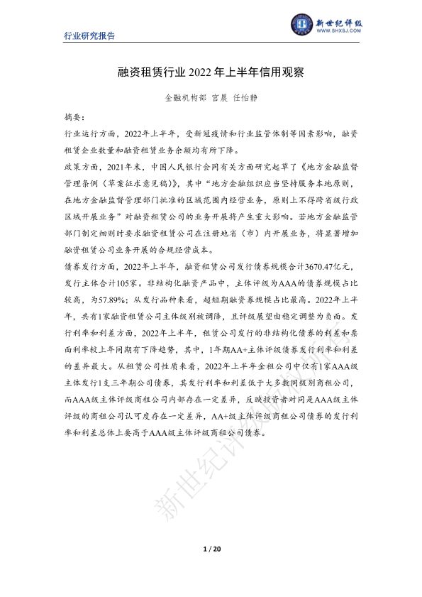 【新世纪评级】【2022】新世纪评级-2022年上半年融资租赁行业信用观察-20页