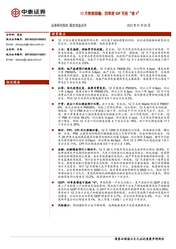 【中泰证券】【20220105】12月数据前瞻:四季度GDP可能“破4”-16页