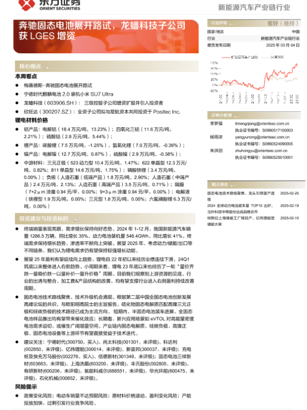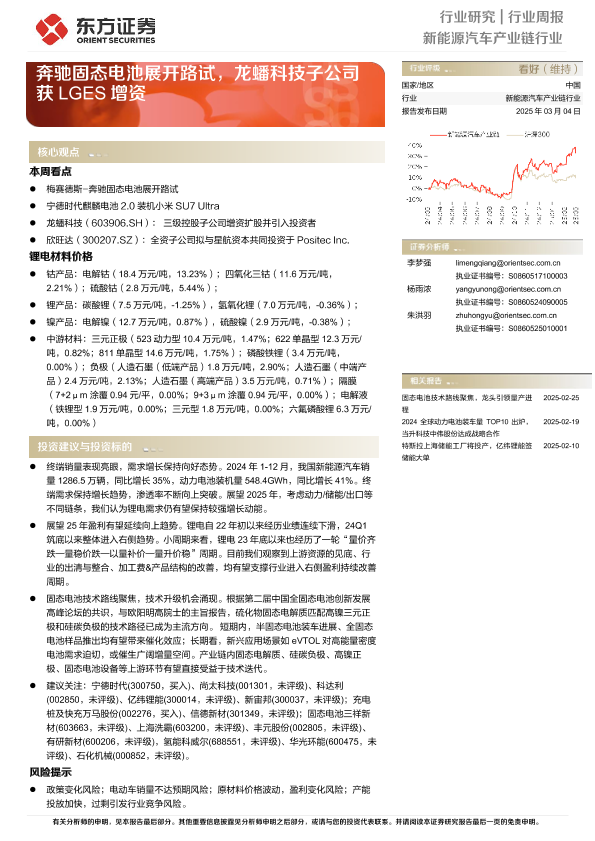 【东方证券】【20250304】20250304-东方证券-新能源汽车产业链行业周报:奔驰固态电池展开路试,龙蟠科技子公司获LGES增资-15页